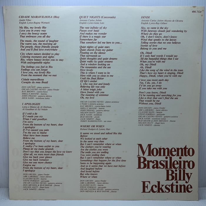 A1 Cidade Maravilhosa/ A2 I Apologize/ A3 Quiet Nights = Corcovado/ A4 Where Or When/ A5 Dindi/ B1 Dora/ B2 Dreamer = Vivo Sonhando/ B3 You and I = Você E Eu/ B4 How Insensitive = Insensatez